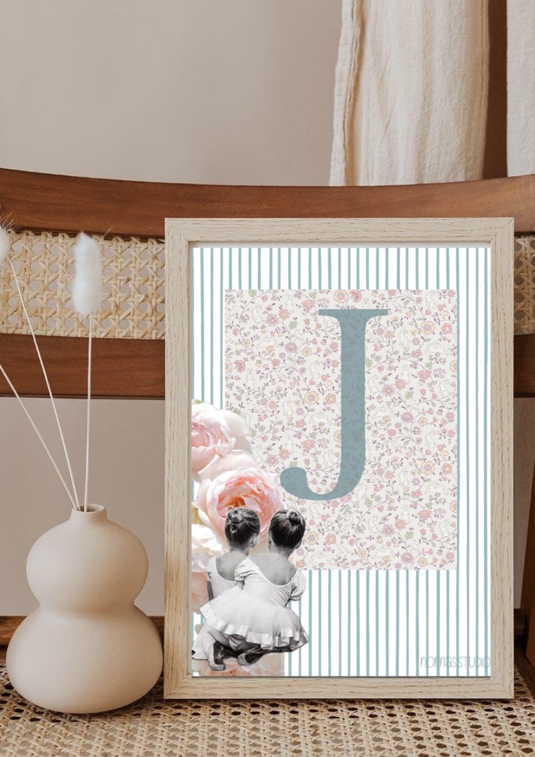Preciosa lámina personalizada con inicial, con imagen de bailarinas.