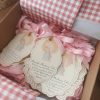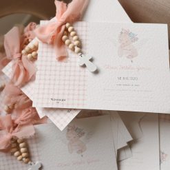 Precioso recordatorio impreso en papel gofrado con tono beige.